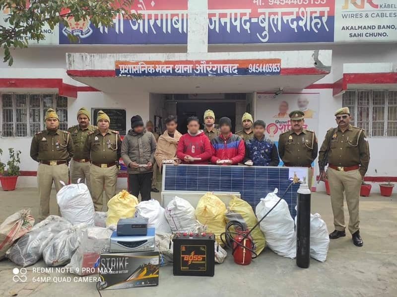 बुलन्दशहर – औरंगाबाद पुलिस द्वारा न्यू गुर्जर मार्किट के पास से पाँच शातिर चोरो पृथ्वीराज उर्फ सोनू पुत्र राजवीर सिंह निवासी गांव मूडी बकापुर थाना औरंगाबाद जनपद बुलन्दशहर, गुड्डू पुत्र गंगाराम सिंह निवासी ग्राम जाडौल मौहल्ला भीमराव अम्बेडकर थाना खानपुर जनपद बुलन्दशहर, गुलशन पुत्र छज्जन सिंह निवासी मौहल्ला टांडा गली नं0 2 थाना कोतवाली देहात जनपद बुलन्दशहर, आकाश पुत्र सोमवीर सिंह निवासी गांव मलकपुर थाना अनूपशहर जनपद बुलन्दशहर, फिरोज पुत्र सुलेमान निवासी मौहल्ला फैसलाबाद मर्दान मस्जिद वाली गली थाना कोतवाली नगर बुलन्दशहर को चोरी करने के उपकरण, सहित गिरफ्तार किया गया। अभियुक्तो की निशादेही पर चार प्लास्टिक कट्टा जिनमें इंवर्टर , पंखे, तांबे का तार , खुले हुए स्टैबिलाईजर व विभिन्न बिजली का सामान , 2 सोलर पैनल , इन्वर्टर बैटरी, जूते चप्पल विभिन्न कम्पनी के, लोवर बनियान व टीशर्ट, हुक्का पीतल का , तोलने का कांटा, बीडी, सिगरेट, बिस्किट एवं टाफी पैकेट, कपडे का पर्दा ,गैस कटर मशीन,हथोडी, छैनी, पाना, सिलेण्डर सहित चोरी किये गये समान को अभियुक्त गुलशन के मकान से बरामद किया गया। गिरफ्तार अभियुक्तों द्वारा कई चोरी की घटनाओं को अंजाम दिया गया है जिससे उन पर कई मुक़दमे दर्ज है। अभियुक्तों को गिरफ़्तार कर जेल भेज दिया गया है ।