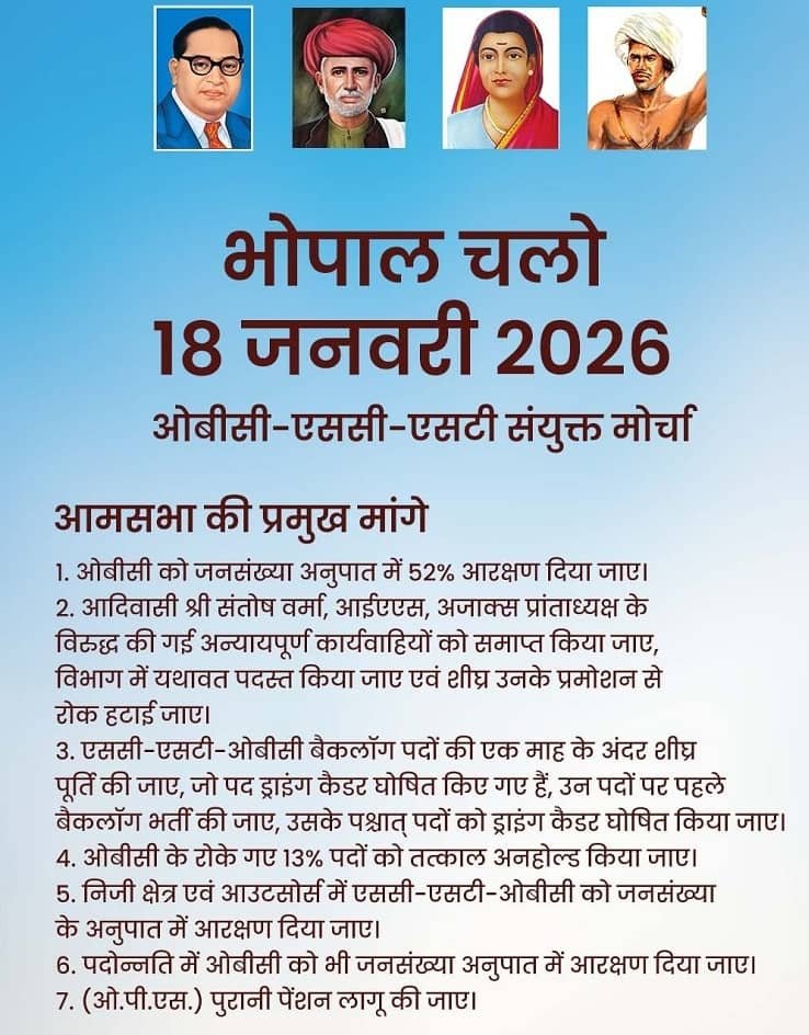 ओबीसी-एससी-एसटी संयुक्त मोर्चा के प्रवक्ता ने कहा, “यह आमसभा सत्ता के खिलाफ नहीं, बल्कि संविधान के पक्ष में है। हम सरकार को याद दिलाना चाहते हैं कि सामाजिक न्याय कोई दया नहीं, बल्कि संवैधानिक अधिकार है। ओबीसी, एससी और एसटी समाज ने लोकतंत्र को मजबूती दी है और अब समय आ गया है कि सरकार भी उनके अधिकारों और सम्मान की रक्षा के लिए ठोस कदम उठाए। 18 जनवरी को भोपाल में उमड़ने वाला जनसैलाब यह स्पष्ट संदेश देगा कि समाज अब चुप नहीं रहेगा।”