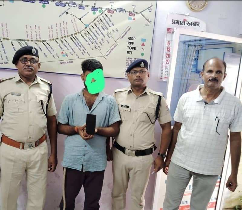 लखीसराय! लखीसराय स्टेशन पर यात्री सुरक्षा व TOPB ड्यूटी में तैनात सहायक उप निरीक्षक मनोज कुमार सिंह, आरक्षी नमन कुमार व आरक्षी अफजल अली ट्रेन संख्या- 63334 डाउन गया -किऊल मेमू से समय 02/35 बजे एक व्यक्ति को संदिग्ध रूप से तेजी से उतरकर भागते हुए देखे। शक होने पर उस व्यक्ति को खदेरकर पकड़ा गया जिस से पूछताछ में अपना नाम पवन कुमार, उम्र 26 वर्ष,पिता कारू सिंह, ग्राम – कारगिर, थाना- रजौली, जिला नवादा, बिहार बताया। संदेह होने पर उसकी तलाशी ली गई तो उसके पैंट के दाहिने जेब से एक अदद मोटोरोला कंपनी का मोबाइल बरामद हुआ। मोबाइल का लॉक खोलने ह बोला गया परन्तु मोबाइल का लॉक नहीं खोल पाया। पूछने पर उसके द्वारा बताया कि आज ही उसने किसी गाड़ी में से एक यात्री के सीट पर से चुराया है। मौके पर उपस्थित यात्रियों से मामले में स्वतंत्र गवाह बनाने हेतु कहने पर कानूनी लफड़ा बता गवाह बनने से इनकार किए तब अपने साथ के स्टाफ को गवाह बनाते हुए जब्ती सूची तैयार कर मोबाइल को जब्त किया गया। कारण बताते हुए गिरफ्तारी ज्ञापन तैयार कर गिरफ्तार किया गया। जब्त मोबाइल पर करण कुमार निवासी महानंदपुर थाना नेमदरगंज जिला नवादा का फ़ोन आया जिनके द्वारा बताया गया कि यह उनका मोबाइल है जो यात्रा के दौरान चोरी हो गया था।