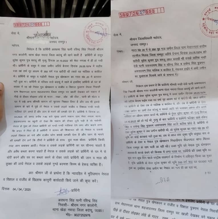 महिला ने बताया कि मेघा नगला, थाना शहज़ाद नगर स्थित गाटा संख्या 20 की भूमि, जिसे उसके ससुर ने 25 मई 1974 को बैनामा कराया था, पर नेपाल पुत्र खेमकरण और अन्य दबंगों ने अवैध रूप से कब्जा कर लिया है। महिला ने यह भी बताया कि इन दबंगों ने मकान का गेट तोड़कर घर में रखा समान भी चुरा लिया है। महिला ने दावा किया कि जिनके नाम पर पहले यह जमीन चढ़ी हुई थी, उन्होंने उस जमीन का सरकारी मुआवजा भी हड़प लिया है।