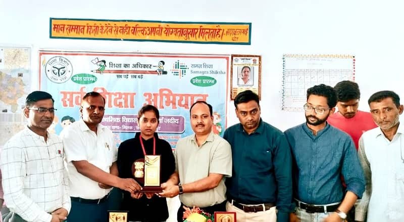 रामपुर: बेसिक शिक्षा परिषद द्वारा संचालित उच्च प्राथमिक विद्यालय पुरैनियां जदीद तहसील मिलक जनपद रामपुर में विद्यालय की पूर्व छात्रा जिसने हाईस्कूल परीक्षा में जनपद में प्रथम स्थान प्राप्त किया, उसके सम्मान में एक कार्यक्रम आयोजित किया गया, सर्वप्रथम मुख्य अतिथि विशिष्ट अतिथि एवं विद्यालय स्टाफ द्वारा आरुषि पटेल को मैडल ,शील्ड एवं प्रशस्तिपत्र प्रदान करते हुए सम्मानित किया गया
