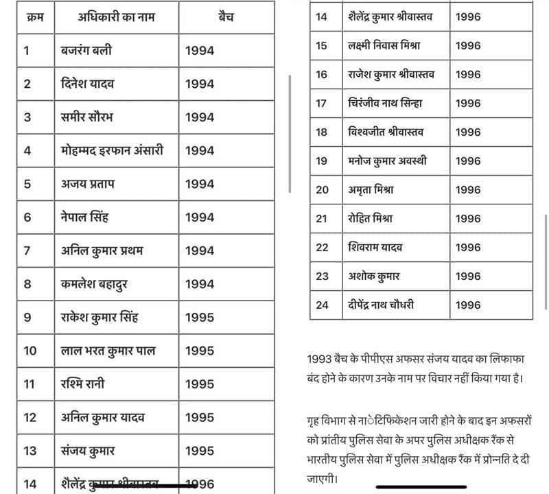 उत्तर प्रदेश में 1995 और 1996 बैच के 24 पुलिस सेवा (PPS) अफसरों को डीपीसी (विभागीय पदोन्नति समिति) के बाद IPS कैडर में प्रमोशन दिया गया है। इस सूची में एक विशेष बात यह है कि प्रमोशन पाने वाले अफसरों में एक पति-पत्नी की जोड़ी भी शामिल है। एसपी सिटी बाराबंकी चिरंजीव नाथ सिन्हा और उनकी पत्नी एडिशनल एसपी रश्मि रानी को IPS प्रमोशन मिला है।
