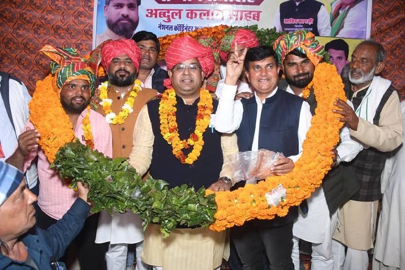 टपूकड़ा. एआईसीसी से नवनियुक्त प्रभारी राजस्थान अल्पसंख्यक विभाग अब्दुल कलाम एवं माननीय आबिद कागजी चेयरमैन राजस्थान प्रदेश कांग्रेस कमेटी अल्पसंख्यक विभाग का राजस्थान के प्रवेश द्वार पर मजीद खान जिला अध्यक्ष जिला कांग्रेस कमेटी खैरथल तिजारा अल्पसंख्यक विभाग के नेतृत्व में भव्य स्वागत किया गया व गाड़ियों के काफिले के साथ उदयपुर गांव के लिए रवाना हुए मटिला से उदयपुर तक सैकड़ो बाइकों से रैली निकालकर ढोल नगाड़ों के साथ खूबसूरत आतिश बाजी पटाखों से स्वागत किया गया गांव उदयपुर में मजीद खान ने अब्दुल कलाम एवं आबिद कागजी को चांदी का मुकुट पहनाकर व