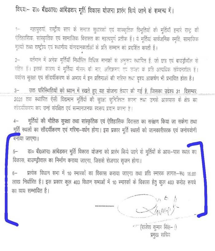 Ambedkar Memorials in 403 Assembly Constituencies in UP to Undergo Beautification; Cabinet Gives Approval.कैबिनेट के निर्णय के अनुसार प्रत्येक विधानसभा क्षेत्र में 10-10 स्मारकों का सौंदर्यीकरण कराया जाएगा। हर स्मारक पर करीब 10 लाख रुपये खर्च किए जाएंगे। इस प्रकार कुल मिलाकर लगभग 403 करोड़ रुपये की लागत से यह कार्य कराया जाएगा।