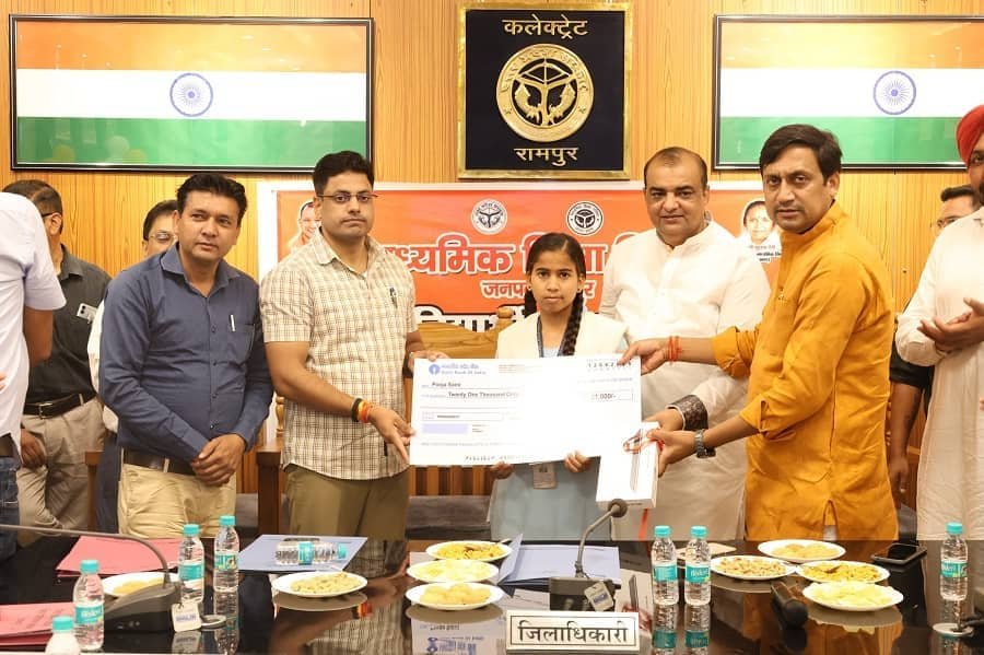 रामपुर शहर विधायक आकाश सक्सेना, जिलाधिकारी जोगिंदर सिंह, पुलिस अधीक्षक विद्यासागर मिश्र और जिला अध्यक्ष हरीश गंगवार की उपस्थिति में हाई स्कूल एवं इंटरमीडिएट की परीक्षा उत्तीर्ण करने वाले मेधावी छात्र-छात्राओं के सम्मान समारोह का आयोजन कलेक्ट्रेट सभागार में किया गया। कार्यक्रम के दौरान जनपद का नाम रोशन करने वाले छात्र-छात्राओं को अधिकारियों एवं जनप्रतिनिधियों द्वारा सम्मानित किया गया और उन्हें बधाई देते हुए उनके उज्जवल भविष्य की कामना की गई। इस दौरान प्रदेश स्तर पर मुख्यमंत्री योगी आदित्यनाथ की अध्यक्षता में लोक भवन सभागार में आयोजित कार्यक्रम का सजीव प्रसारण भी कराया गया। कार्यक्रम में हाई स्कूल एवं इंटरमीडिएट परीक्षा में सर्वाधिक अंक प्राप्त करने वाले 10-10 मेधावी छात्र-छात्राओं में से प्रत्येक को 21 हजार रुपये का चेक, टैबलेट, मेडल व प्रशस्ति पत्र देकर सम्मानित किया गया।