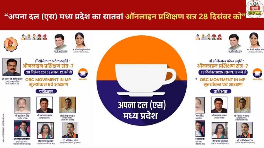भोपाल, दिसंबर 2025 : अपना दल (एस) की मध्य प्रदेश इकाई राष्ट्रीय अध्यक्ष एवं केंद्रीय राज्य मंत्री श्रीमती अनुप्रिया पटेल के कुशल नेतृत्व में संगठन को निरंतर मजबूत करने की दिशा में सक्रियता से कार्य कर रही है। इसी कड़ी में पार्टी के राष्ट्रीय महासचिव एवं मध्य प्रदेश प्रभारी श्री आर.बी. सिंह पटेल के मार्गदर्शन में रविवार, 28 दिसंबर 2025 को सातवां ऑनलाइन प्रशिक्षण सत्र आयोजित किया जा रहा है। पिछड़ा वर्ग मूल्यांकन एवं आरक्षण विषय पर होने वाले इस सत्र में मध्य प्रदेश और उत्तर प्रदेश के वरिष्ठ नेता अपने विचार साझा करेंगे। सत्र का संचालन राजनीतिक रणनीतिकार डॉ. अतुल मलिकराम करेंगे।