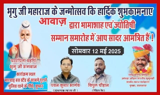 पुष्कर, ऐलनाबाद: अखिल भारतीय भृगुवंशी भार्गव समाज धर्मशाला सेवा समिति, पुष्कर द्वारा भृगुजी महाराज के पावन जन्मोत्सव के अवसर पर एक भव्य भामाशाह एवं ज्योतिषी सम्मान समारोह का आयोजन किया जा रहा है। समिति ने समस्त भार्गव समाज बंधुओं से इस शुभ अवसर पर सपरिवार उपस्थित होने का आग्रह किया है।