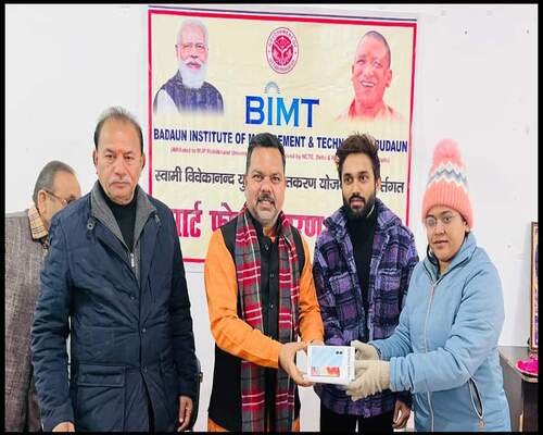 बदायूँ । बदायूँ इस्टीट्यूट ऑफ मैनेजमैण्ट एण्ड टैक्नोलॉजी में कॉऔर लेज परिसर में मोबाइल वितरण कार्यक्रम का आयोजन में स्वामी विवेकानन्द युवा सशक्तिकरण योजना के कार्यक्रम का शुभारंभ जिलाध्यक्ष राजीव कुमार गुप्ता कॉलेज चेयरपर्सन मुकेश रस्तोगी द्वारा मॉं सरस्वती के समक्ष दीप प्रज्जवलित एवं पुष्प अर्पण कर, कॉलेज के 157 छात्र-छात्राओं को मोबाइल वितरण किया गया।