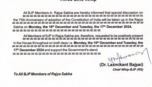राज्यसभा में 16-17 दिसंबर को संविधान पर बहस, BJP ने जारी किया तीन-लाइन व्हिप