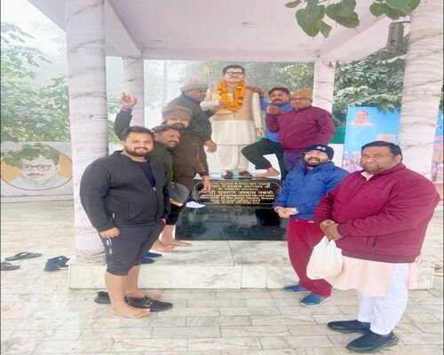 भाजपाइयों ने प्रतिमा पर स्नान कराकर किया माल्यार्पण