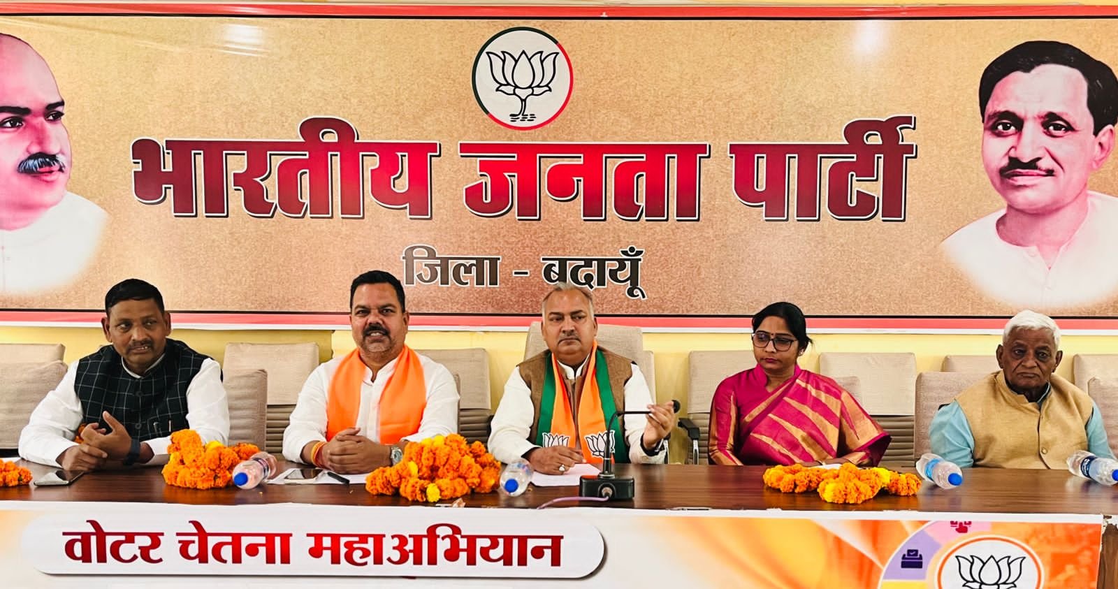 बदायूँ। भाजपा कार्यालय पर वोटर चेतना महाअभियान की जिला कार्यशाला में मुख्य अथिति भाजपा प्रदेश उपाध्यक्ष/प्रदेश प्रभारी किसान मोर्चा व जिला प्रभारी दिनेश कुमार शर्मा, जिलाध्यक्ष राजीव कुमार गुप्ता, सांसद डॉ. संघमित्रा मौर्य, आँवला सांसद धर्मेन्द्र कश्यप, पूर्व जिलाध्यक्ष हरप्रसाद सिंह पटेल, पूर्व चेयरमैन दीपमाला गोयल ने डॉ श्याम प्रसाद मुखर्जी, पं० दीनदयाल उपाध्याय व भारत माता के चित्र के समक्ष दीप प्रज्वलन करके विधिवत शुभारंभ हुआ।