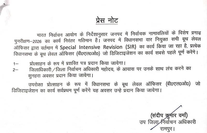 इसके साथ ही बेहतर कार्य प्रदर्शन करने वाले बीएलओ को जिलाधिकारी/जिला निर्वाचन अधिकारी के आवास पर लंच करने का विशेष अवसर भी दिया जाएगा। यह पहल कर्मचारियों को प्रोत्साहित करने और एसआईआर कार्य को समय पर तथा गुणवत्तापूर्वक पूरा करने के उद्देश्य से की गई है।