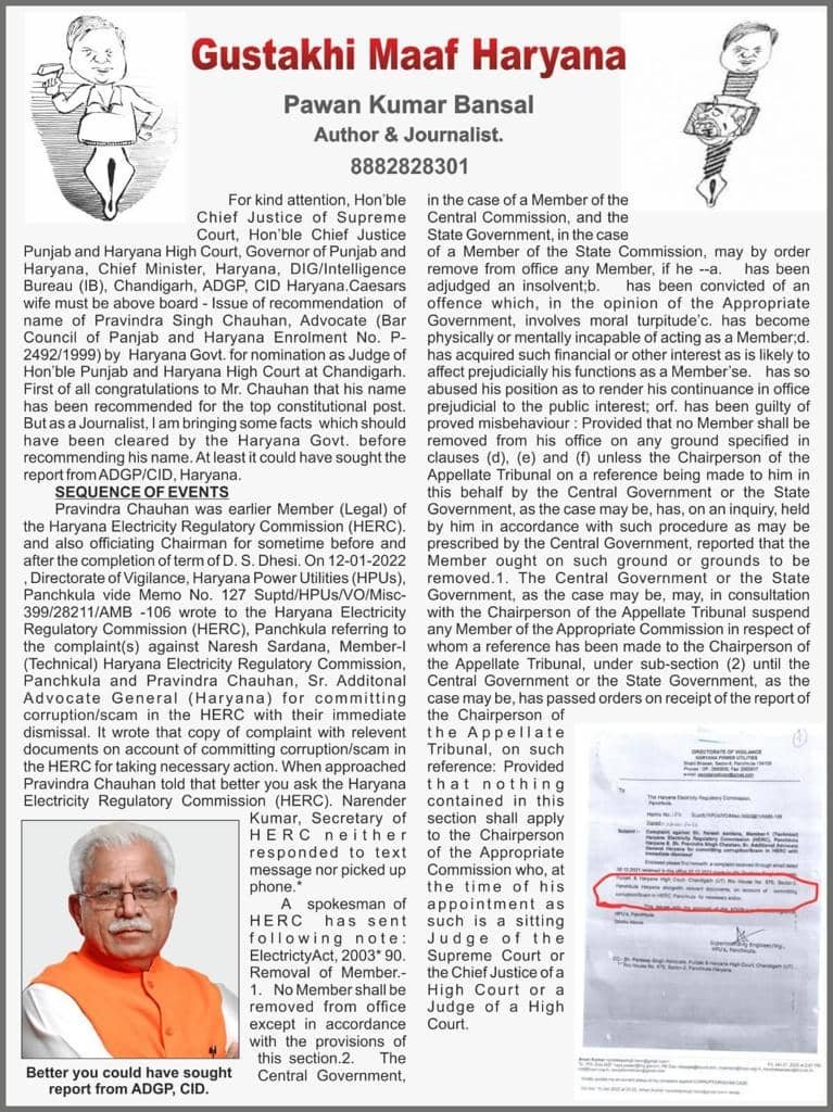 The appointment of Parvinder Chauhan as the Advocate General (AG) of Haryana has sparked controversy. Despite his past being mired with controversies, he has been appointed to this prestigious post. Chauhan’s previous tenure as a Member Legal of the Haryana Electricity Regulatory Commission and Senior Additional Advocate General was marred with several issues. His name was even recommended for the position of Judge in the Punjab and Haryana High Court but was not cleared by the Supreme Court Collegium.