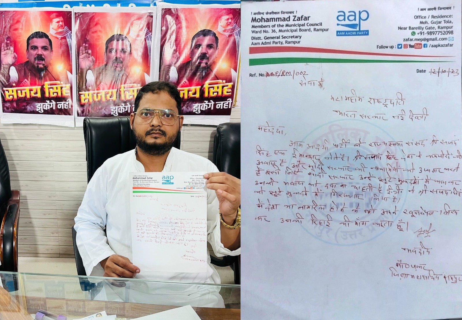 आम आदमी पार्टी के ज़िला महासचिव एवं वार्ड36 के सभासद मौहम्मद ज़फ़र ने भारत के राष्ट्रपति को अपने खून से पत्र लिखकर राज्यसभा सांसद संजय सिंह की रिहाई की माँग की।