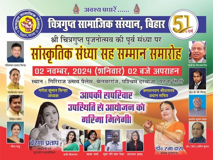 चित्रगुप्त सामाजिक संस्थान के प्रधान सचिव श्री कमलनयन श्रीवास्तव और अध्यक्ष श्री गणेश कुमार सिन्हा ने बताया कि सम्पूर्ण प्राणी-जगत के पाप-पुण्य का लेखा-जोखा करने वाले कलमजीवियों के आराध्य देव, अक्षर देवता भगवान श्री चित्रगुप्त पूजनोत्सव, 2024 की पूर्व संध्या पर चित्रगुप्त सामाजिक संस्थान, बिहार के तत्वावधान में गिरिराज उत्सव पैलेस, बेलवर गंज, पश्चिम दरवाजा, पटना सिटी में आगामी 02 नवम्बर, 2024 (शनिवार) को 2:00 बजे ‘सांस्कृतिक संध्या’ का आयोजन किया गया है। उन्होंने बताया कि इस कार्यक्रम का उद्घाटन पूर्व केन्द्रीय मंत्री एवं सांसद (लोकसभा) श्री रविशंकर प्रसाद करेंगे। इस अवसर पर मुख्य अतिथि बिहार विधान सभा के अध्यक्ष श्री नन्द किशोर यादव, अध्यक्षता ख्यातिनाम चिकित्सक पद्मश्री डॉ. गोपाल प्रसाद सिन्हा करेंगे।विशिष्ट अतिथि के रूप में बिहार के नगर विकास एवं आवास तथा विधि मंत्री श्री नितिन नवीन, महापौर पटना श्रीमती सीता साहु, उप महापौर, पटनाश्रीमती रेशमी चन्द्रवंशी, समाजसेवी श्री राजेश बल्लभ को आमंत्रित किया गया है।