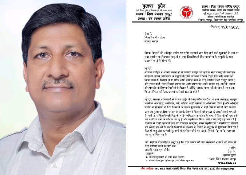 रामपुर: सदर तहसील के कर्मचारी व अपर जिलाधिकारी वित्त कार्यालय के बाबुओं के द्वारा किसानों को परेशान कर भ्रष्टाचार किया जा रहा है। रामपुर जिला पंचायत के सदस्य मुस्तफा हुसैन ने मुख्यमंत्री, मंडलायुक्त व जिलाधिकारी को पत्र लिखकर भ्रष्टाचार रोकने की मांग की है।