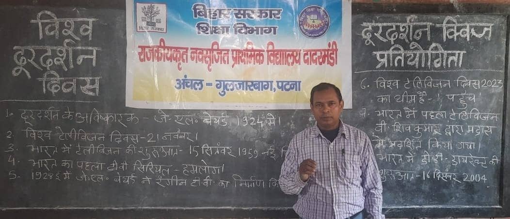 पटना। विश्व दूरदर्शन दिवस के अवसर पर राजकीयकृत नवसृजित प्राथमिक विद्यालय दादरमंडी, गुलजारबाग, पटना में शिक्षक सूर्य कान्त गुप्ता के द्वारा छात्र-छात्राओं के बीच दूरदर्शन क्विज प्रतियोगिता कराई गई, जिसमें प्रेस मध्य विद्यालय एवं मध्य विद्यालय रमना के छात्र-छात्राओं ने भी भाग लिया। क्विज में दूरदर्शन के अविष्कार से लेकर अब तक की विकास यात्रा के बारे में प्रश्न पूछे गए। क्विज में प्रथम स्थान सौम्या कुमारी, द्वितीय स्थान सोनाली कुमारी तथा तृतीय स्थान सन्नी कुमार ने प्राप्त किया। इस प्रतियोगिता में एंजेल कुमारी, रिया कुमारी, करुणा कुमारी, रागिनी कुमारी, खुशी कुमारी, मुस्कान कुमारी, रवीना परवीन, अनामिका कुमारी, आराध्या कुमारी, सुमन कुमारी सहित अन्य छात्र-छात्राओं ने भाग लिया।