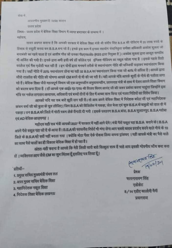 प्रयागराज। बेसिक शिक्षा विभाग में भ्रष्टाचार के आरोपों के मामले एक बार फिर से सुर्खियों में आ गए हैं। ताजा मामला उत्तर प्रदेश के प्रयागराज जिले का है, जहां बेसिक शिक्षा मंत्री संदीप सिंह पर 20 लाख रुपये के हिसाब से वसूली करवा कर बेसिक शिक्षा अधिकारी (B.S.A) बनाने का आरोप लगा है। इस मामले को लेकर उत्तर प्रदेश के मुख्यमंत्री योगी आदित्यनाथ को एक पत्र लिखा गया है, जो अब सोशल मीडिया पर तेजी से वायरल हो रहा है।