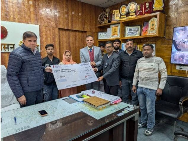 ऐलनाबाद, 06 जनवरी( एम पी भार्गव ): हरियाणा कौशल रोजगार निगम के तहत कार्यरत कर्मचारी स्व. सोनू की आकस्मिक मृत्यु के बाद एक्सिस बैंक ने उनके परिवारजनों को 24 लाख रुपये की बीमा राशि का चेक सौंपा। अतिरिक्त उपायुक्त विरेंद्र सहरावत की उपस्थिति में बैंक अधिकारियों ने स्व. कर्मचारी के परिवार को सहायता राशि का चैक सौंपा। बैंक अधिकारियों ने कर्मचारी की पत्नी पूनम को 20 लाख रूपये तथा उनके पुत्र सत्यम कुमार को शिक्षा के लिए चार लाख रूपये का चैक सौंपा।