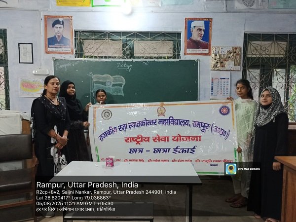रामपुर में “हर घर तिरंगा अभियान” के अंतर्गत प्रथम चरण में महाविद्यालय की राष्ट्रीय सेवा योजना इकाइयों, राष्ट्रीय कैडेट कोर, रोवर-रेंजर व छात्र छात्राओं द्वारा राष्ट्रीय ध्वज के सम्मान, संरचना , आजादी की वीर गाथा, तिरंगा निर्माण प्रतियोगिता आयोजित की गयी। महाविद्यालय प्राचार्य डॉ जागृति मदान धीगड़ा , NCC प्रभारी डॉ बिजेन्द्र सिंह, डॉ साक्षी त्यागी ,NSS कार्यक्रम अधिकारी डॉ नरेश कुमार ,डॉ ईरम नईम, डॉ प्रमोद कुमार, रेंजर रोवर प्रभारी डॉ राजेश कुमार ,डॉ माया भारती, डॉ बेबी तबस्सुम ,डॉ निधि गुप्ता, डॉ कैश मियां, डॉ नेहा नागपाल द्वारा विभिन्न कार्यक्रम आयोजित कराये गये। यह अभियान 2 अगस्त 2025 से 15 अगस्त 2025 तक चलेगा । जिसमें अलग-अलग कार्यक्रम आयोजित कर छात्र-छात्राओं व आम जनमानस में देशभक्ति की भावना का विकास राष्ट्रीय चिन्हों, प्रतीकों , राष्ट्रगान व आजादी की लड़ाई में अपने प्राण न्यौछावर करने वाले वीर शहीदों को याद किया जाएगा।