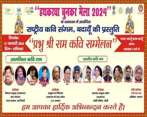 Handloom Weaver's Fair will be organized by Rashtriya Kavi Sangam on the evening of 13बदायूं १२ जनवरी बदायूं क्लब, बदायूं में विगत ३ जनवरी से चल रहे हथकरघा बुनकर मेला में शनिवार १३ जनवरी को दुपहर ३ बजे से क्लब के मेला प्रांगड़ में विराट कवि सम्मलेन का आयोजन किया जायेगा। भगवान श्री राम को समर्पित ये कवि सम्मेलन राष्ट्रिय कवि संगम द्वारा बदायूं इकाई की ओर से आयोजित किया जायेगा जिसमे स्थानीय कवि  नरेंद्र गरल, डॉ. रामबहादुर व्यथित, डॉ. सोनरूपा विशाल, डॉ. अरविन्द धवल,  कुलदीप अंगार, डॉ. अक्षत अशेष,  चंद्र पल सरल,  कुमार आशीष, सरिता सिंह रहेंगे एवं साथ ही बहार से आमंत्रित कवियों में मैनपूरी से मनोज चौहान, धौलपुर से पदम् गौतम, आगरा से मोहित सक्सेना एवं सोरों से मनोज मधुवन को आमंत्रित किया गया है। कविसम्मेलन के संयोजक कवि अभिषेक अनंत ने बताया की आयोजन में अतिथि के रूप में राष्ट्रिय स्वयं सेवक संघ के विभाग प्रचारक  विशाल जी, नगर विधायक  महेश चंद्र गुप्ता जी एवं भाजपा जिलाध्यक्ष  राजीव गुप्ता जी रहेंगे।