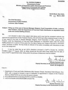 लखनऊ : IAS अधिकारी प्रशांत शर्मा को भारतीय खाद्य निगम (FCI) के लखनऊ रीजन का नया जनरल मैनेजर (GM) नियुक्त किया गया है। वह 2012 बैच के IAS अधिकारी हैं और यह नियुक्ति सेंट्रल स्टाफिंग योजना के तहत की गई है। डीओपीटी (Department of Personnel and Training) ने इस संबंध में आदेश जारी किया है। प्रशांत शर्मा अगले तीन साल तक इस महत्वपूर्ण पद पर अपनी सेवाएं देंगे।