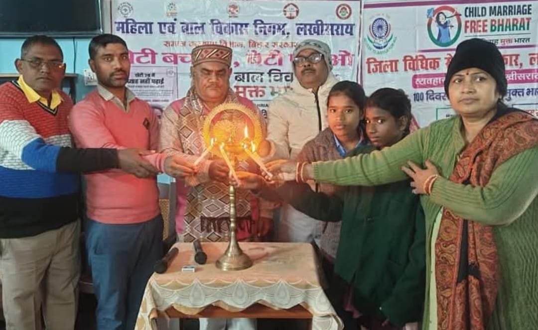 लखीसराय(सरफराज आलम)महिला एवं बाल विकास निगम तथा जिला विधिक प्राधिकार, लखीसराय के संयुक्त तत्वावधान में 100 दिवसीय बाल विवाह मुक्त भारत अभियान के तहत जागरूकता सह शपथ कार्यक्रम का आयोजन कस्तूरबा गांधी बालिका विद्यालय, पहाड़पुर (बड़हिया) में किया गया। कार्यक्रम की अध्यक्षता महिला एवं बाल विकास निगम के जिला परियोजना प्रबंधक डॉ. मनोज कुमार सिन्हा ने की।