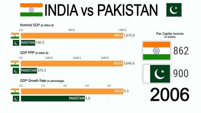भारत की जीडीपी पाकिस्तान से लगभग 10 गुना अधिक है, जो भारत के तेज विकास और पाकिस्तान की स्थिरता में कमी को दर्शाता है।