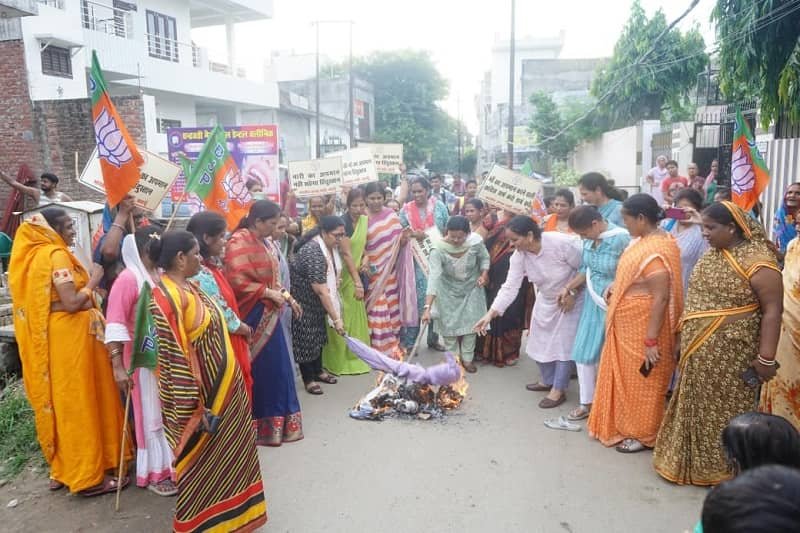 बदायूं। बिहार के दरभंगा जिले में राहुल गांधी के मंच से कांग्रेस नेता मोहम्मद रिजवी उर्फ राजा द्वारा प्रधानमंत्री नरेंद्र मोदी और उनकी दिवंगत माता जी के लिए अभद्र भाषा का इस्तेमाल किए जाने के विरोध में भाजपा महिला मोर्चा बदायूं ने जोरदार प्रदर्शन किया। इस दौरान महिला मोर्चा ने कांग्रेस जिलाध्यक्ष अजीत यादव के कैम्प कार्यालय/आवास नेकपुर पर धरना देते हुए राहुल गांधी का पुतला दहन किया।