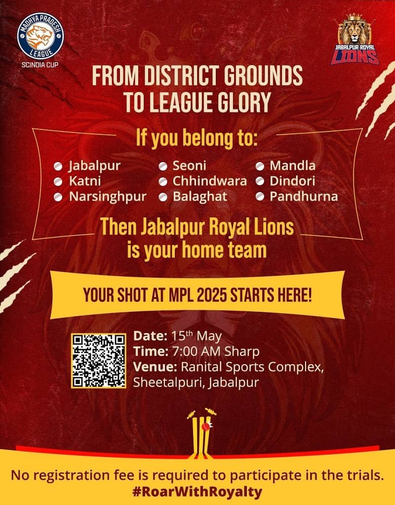 यह अवसर हाथ से जाने मत दीजिए, क्योंकि अपने शहर की पहचान बनने का मौका बार-बार नहीं आता। जबलपुर रॉयल लॉयंस के लिए खेलना सिर्फ एक ट्रायल नहीं, बल्कि अपनी मेहनत, जुनून और काबिलियत को साबित करने का मंच भी है। यह वह मौका है, जहाँ आप भीड़ से अलग दिख सकते हैं और एक नई शुरुआत कर सकते हैं।