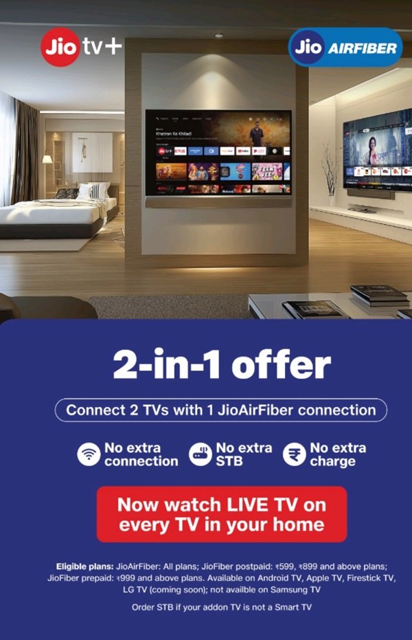 जियो टीवी प्लस टू इन वन ऑफर: एक कनेक्शन से चलाएं दो टीवी
