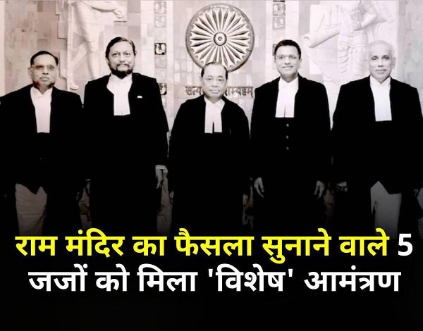 इन न्यायाधीशों में भारत के पूर्व चीफ जस्टिस रंजन गोगोई, पूर्व सीजेआई एसए बोबडे, चीफ जस्टिस डीवाई चंद्रचूड़ और सुप्रीम कोर्ट के पूर्व न्यायाधीश अशोक भूषण और एस अब्दुल नजीर शामिल हैं. गौरतलब है पांच जजों की संवैधानिक पीठ ने 2019 में राम मंदिर के निर्माण के पक्ष में फैसला सुनाया था।