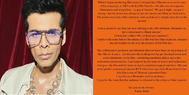 करण जौहर ने गर्व के साथ कहा कि वह धर्मा प्रोडक्शंस के तहत हिंदी सिनेमा में 24वें डेब्यू डायरेक्टर को लॉन्च कर रहे हैं। उन्होंने इंस्टाग्राम पर लिखा, “मुझे गर्व है कि हम अपनी अगली फिल्म के साथ हिंदी सिनेमा के 24वें डेब्यू डायरेक्टर को लॉन्च कर रहे हैं,” और यह भी कहा कि धर्मा प्रोडक्शंस द्वारा लॉन्च किए गए 90% डायरेक्टर्स “आउटसाइडर्स” हैं।