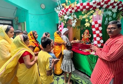 गायत्री परिवार के संजीव कुमार शर्मा ने वेदमंत्रोच्चारण कर विघ्नहर्ता गणपति बप्पा मोरया भगवान श्री गणेश की स्थापना कराई। उन्होंने कहा कि भगवान श्री गणेश मंगल मूर्ति हैं, बुद्धि के देवता हैं, इनकी आराधना से विघ्न-बाधाएं दूर होती हैं । उमाशंकर शर्मा पत्नी इंद्रावती शर्मा मुख्य यजमान के रूप में रहे। पुष्पा देवी शर्मा, रिंकू शर्मा, चेतन शर्मा, चंचल कश्यप, नीलू शर्मा ने भगवान श्री गणेश का मनभावन श्रृंगार कर पूजन किया और मेवा-मिष्ठान का भोग लगाया। मातृ-शक्तियों और देवकन्याओं ने विघ्नहर्ता भगवान श्रीगणेश की सुसज्जित प्रज्ज्वलित दीपकों और घंटे घड़ियालों के साथ भव्य आरती की। गणपति बप्पा मोरिया के जयकारों से वातावरण गुंजायमान रहा। इस मौके पर रिंकू शर्मा, जूही शर्मा, मोहित शर्मा, ट्विंकल, नितिन शर्मा, गोलू, मनु शर्मा, श्रद्धा शर्मा, पुष्पा देवी शर्मा आदि मौजूद रहीं।