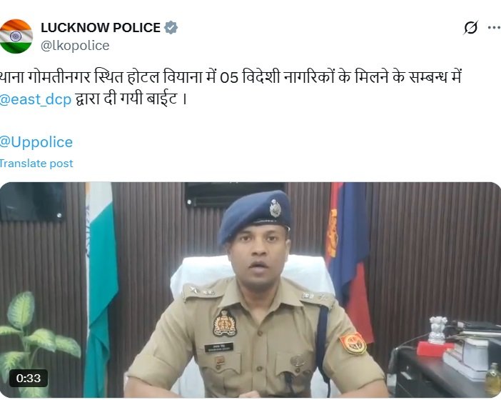 लखनऊ। डीसीपी पूर्वी शशांक सिंह के निर्देशन में गोमतीनगर पुलिस ने एक बड़ी कार्रवाई को अंजाम दिया है। पुलिस टीम ने गोमतीनगर स्थित होटल वियाना में दबिश दी, जहां ओमान के 5 नागरिक बिना सूचना और अनुमति के ठहरे हुए पाए गए।