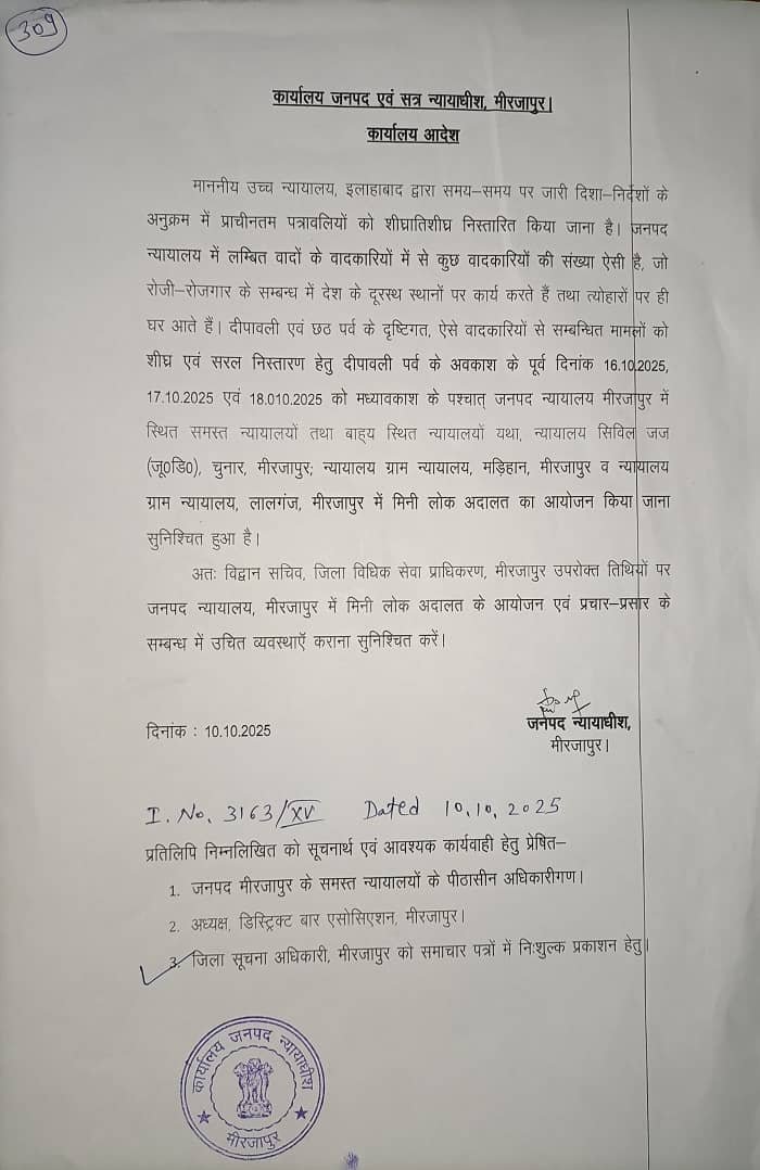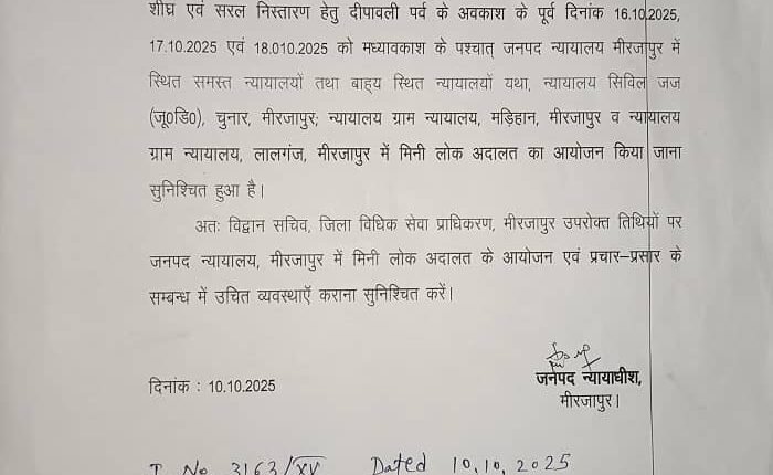 मिर्जापुर। वादकारियों की सुविधा और लंबित मामलों के शीघ्र निस्तारण के उद्देश्य से जनपद न्यायालय मीरजापुर में मिनी लोक अदालत का आयोजन किया जाएगा। यह लोक अदालत आगामी 16, 17 और 18 अक्टूबर 2025 को आयोजित होगी।