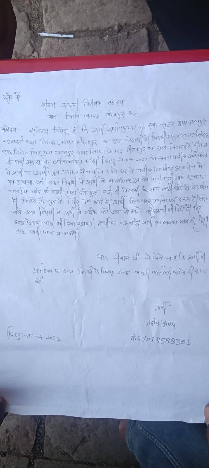 प्रधान पति बबलू यादव ने आरोप लगाया है कि उनके 15 वर्षीय पुत्र प्रशांत कुमार को 21 अप्रैल 2025 की सुबह करीब 8:00 बजे उस वक्त मारा-पीटा गया जब वह शौच के लिए अपने घर से करीब 100 मीटर दूर बगीचे में गया था।