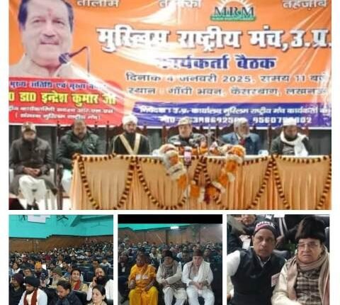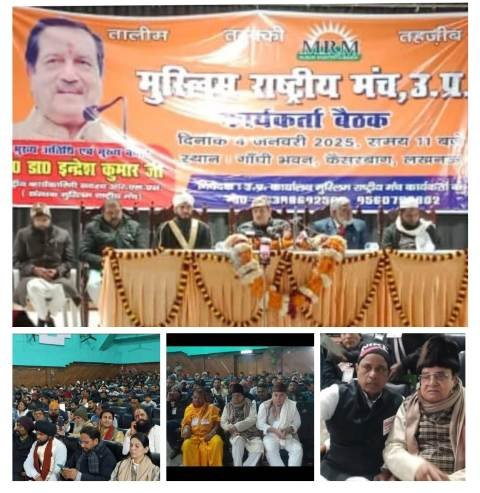 लखनऊ: मुस्लिम राष्ट्रीय मंच उत्तर प्रदेश की कार्यकर्ता बैठक 4 जनवरी को लखनऊ के गांधी स्मृति हाल में आयोजित की गई। इस बैठक में मंच के सैकड़ों कार्यकर्ताओं ने भाग लिया, जबकि मुख्य वक्ता के रूप में मुस्लिम राष्ट्रीय मंच के मार्गदर्शक डॉ. इंद्रेश कुमार ने अपने विचार प्रस्तुत किए। बैठक की शुरुआत मुफ्ती नोमान साहब की कुरआन पाक की तिलावत से हुई और मुफ्ती मलंग साहब ने मंच की दुआ पढ़ी।