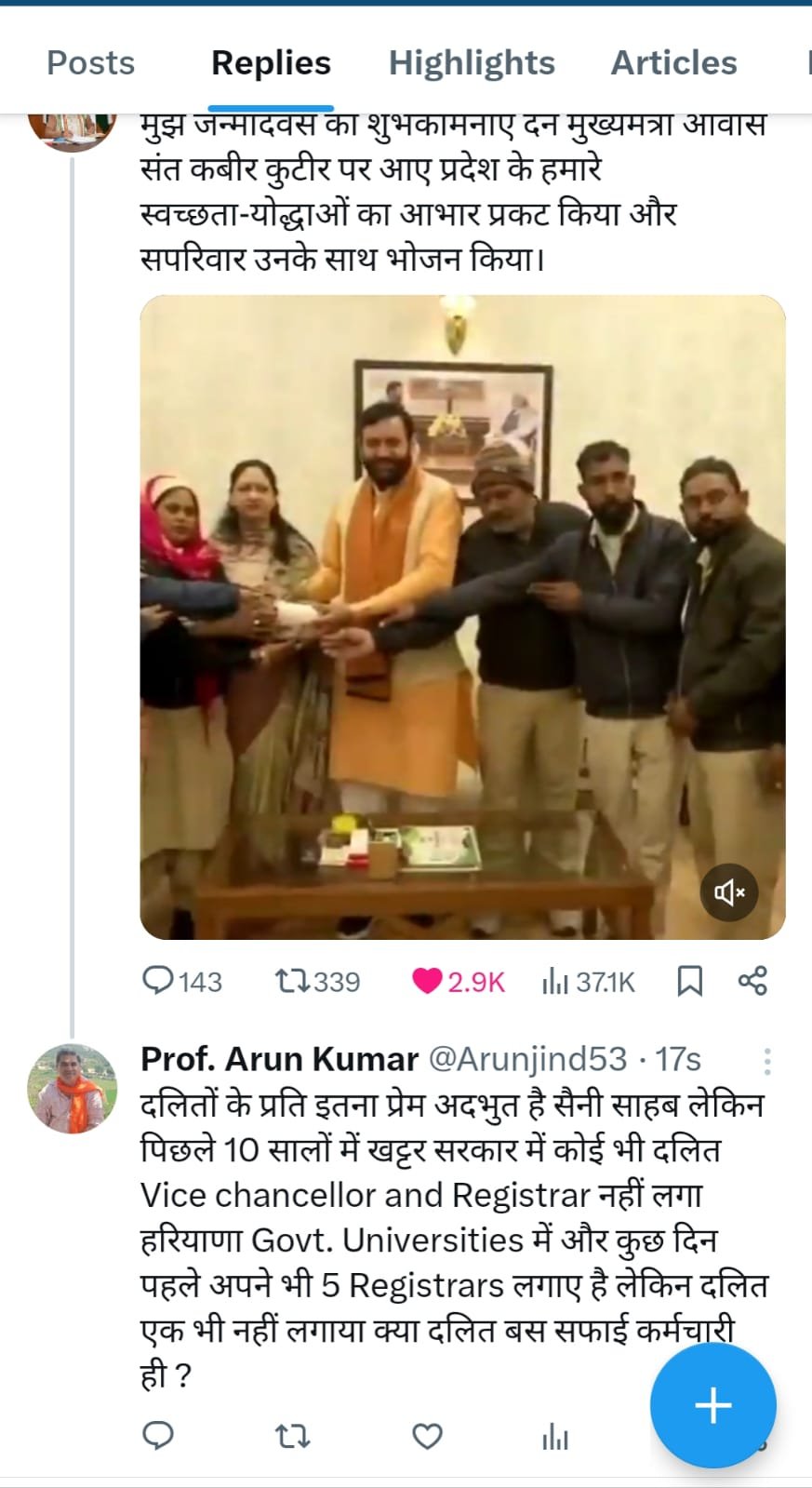 नायब सैनी का दलित प्रेम -जन्मदिन पर शुभ कामना देने आये स्वच्छता -योधाओं के साथ सपरिवार संत कबीर कुटी में भोजन किया ! दलित प्रेम केवल दिखावा -हमारे जागरूक पाठक प्रो अरुण कुमार के सौजन्य सेi *बीजेपी और सीएम नायब सैनी का…दलितों से प्रेम सिर्फ दिखावा है i दलितों के लिए बस छोटी नौकरी ही है जैसे चपड़ासी और स्वीपर i लेकिन हरियाणा की सरकारी यूनिवर्सिटीज में दलित समुदाय का व्यक्ति न तो वीसी लग सकता है ओर न ही रजिस्ट्रार । आज हाल फिलहाल हरियाणा के सभी सरकारी यूनिवर्सिटीज मे सब वीसी और रजिस्ट्रार स्वर्ण जाती समुदाय के है i एक भी दलित समुदाय से नहीं है कुछ दिन पहले 5 रजिस्ट्रार नियुक्त किए गए है एक भी दलित समुदाय से नहीं है