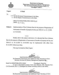 हरियाणा में 1 दिसंबर से नए कलेक्टर रेट लागू किए जाएंगे, जिसके चलते जमीनों की रजिस्ट्री महंगी हो सकती है। राजस्व विभाग की ओर से इस संबंध में आदेश जारी किए गए हैं। मुख्यमंत्री नायब सैनी के अधीन रेवेन्यू विभाग ने सभी मंडलों के कमिश्नर और उपायुक्तों को इन आदेशों का पालन सुनिश्चित करने का निर्देश दिया है।