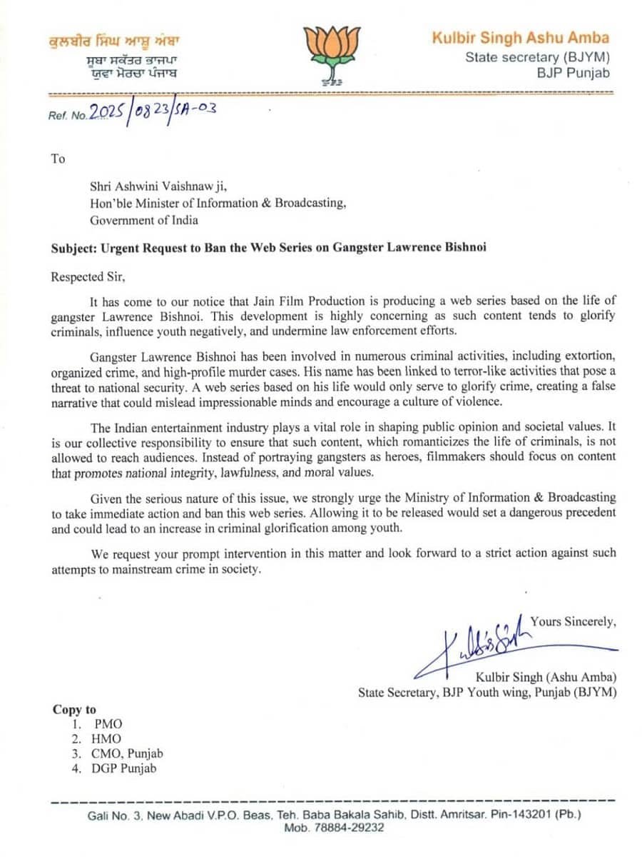 गैंगस्टर लॉरेंस बिश्नोई पर बन रही वेब सीरीज का विरोध शुरू, भाजपा नेता कुलबीर सिंह ने केंद्र सरकार को लिखा पत्र
