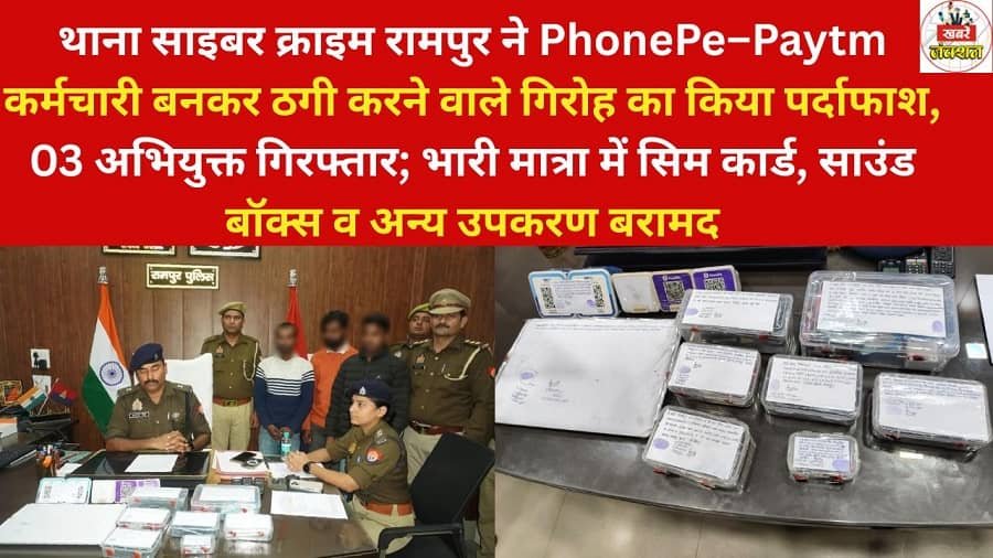 रामपुर। थाना साइबर क्राइम पुलिस ने एक बड़े साइबर ठगी गिरोह का भंडाफोड़ करते हुए तीन अभियुक्तों को गिरफ्तार किया है। ये आरोपी खुद को PhonePe और Paytm के कर्मचारी बताकर दुकानदारों से ठगी करते थे। पुलिस ने गिरफ्तारी के दौरान आरोपियों से मोबाइल, लैपटॉप, सिम कार्ड, साउंड बॉक्स व बारकोड स्टिकर्स सहित भारी मात्रा में उपकरण बरामद किए हैं।