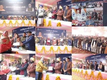 जिलाधिकारी श्री जोगिन्दर सिंह ने कार्यक्रम में उपस्थित सभी जनप्रतिनिधियों, अधिकारियों, लाभार्थियों और आम जन को नशा मुक्ति एवं स्वच्छता की शपथ दिलाई। इस दौरान राज्यमंत्री श्री बलदेव सिंह औलख ने अपने संबोधन में कहा कि घर का मालिकाना हक मिलने से अब किसी प्रकार का झगड़ा नहीं होगा और लोग आसानी से बैंक से ऋण प्राप्त कर सकेंगे। उन्होंने यह भी कहा कि केंद्र और प्रदेश सरकार समाज के अंतिम पायदान पर खड़े व्यक्तियों को विकास की मुख्य धारा से जोड़ने का कार्य कर रही है और इस योजना के माध्यम से गरीबों, किसानों और महिलाओं के लिए कई योजनाएं लागू की जा रही हैं।