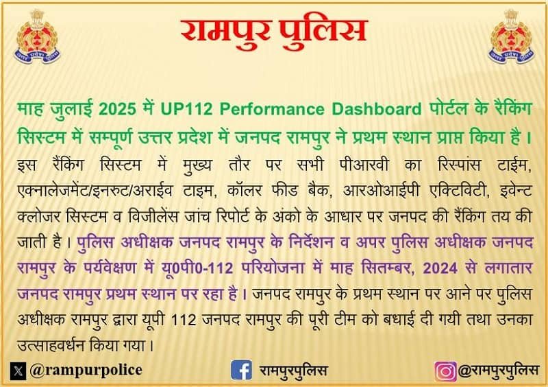 रामपुर पुलिस बनी यूपी-112 में अव्वल, जुलाई 2025 की परफॉर्मेंस रैंकिंग में पूरे प्रदेश में प्रथम स्थान