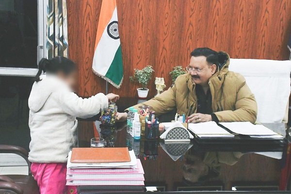 जनसुनवाई के दौरान पुलिस अधीक्षक द्वारा फरियादी के साथ आई छोटी बच्ची को टॉफी दी गई, जिससे बच्ची के चहरे पर खुशी छलक गयी।
