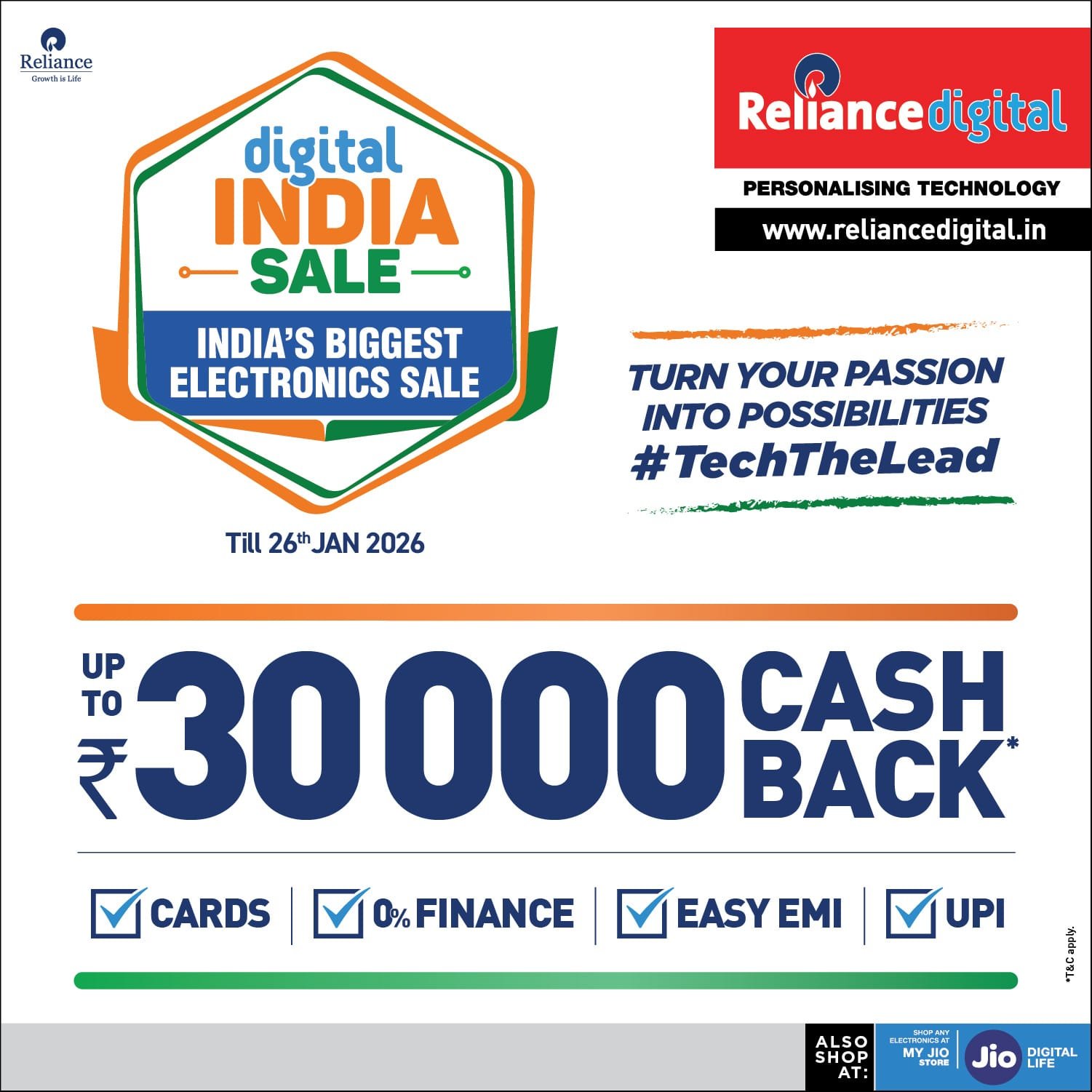 मुंबई: रिलायंस डिजिटल ने अपनी बहुत पसंद की जाने वाली डिजिटल इंडिया सेल की वापसी की घोषणा की है, यह सेल ग्राहकों के लिए इलेक्ट्रॉनिक्स और होम अप्लायंसेस पर शानदार ऑफर्स लेकर आई है. आज से शुरू होने वाली यह सेल 26 जनवरी, 2026 तक चलेगी, ग्राहक ₹26,000* तक इंस्टंट बैंक डिस्काउंट, कंज़्यूमर ड्यूरेबल लोन पर ₹30,000* तक कैशबैक, और UPI पेमेंट पर 5% अनलिमिटेड डिस्काउंट* वाली ज़बरदस्त बचत का फायदा उठा सकते हैं. टेक्नोलॉजी को अपग्रेड करना, ज़्यादा आसान और किफायती बनाने के लिए डिज़ाइन की गई यह सेल, प्रमुख ब्रांड्स और प्रोडक्ट कैटेगरी में आकर्षक डील्स दे रही है. डिजिटल इंडिया सेल देश भर के सभी रिलायंस डिजिटल और मायजियो स्टोर्स के साथ-साथ www.reliancedigital.in पर ऑनलाइन भी उपलब्ध है.