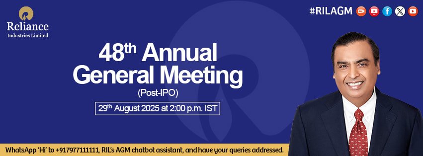 मुंबई। रिलायंस इंडस्ट्रीज़ लिमिटेड (RIL) अपनी 48वीं वार्षिक आम बैठक (Post-IPO) शुक्रवार, 29 अगस्त 2025 को आयोजित करने जा रही है। यह बैठक दोपहर 2 बजे से वीडियो कॉन्फ्रेंसिंग (VC) और अन्य ऑडियो-विजुअल माध्यमों (OAVM) के जरिए होगी।
