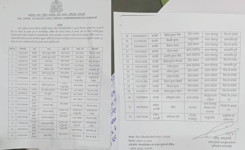 वरुणा जोन के अंतर्गत विभिन्न थानों और चौकियों में कार्यरत इन पुलिसकर्मियों को नई तैनाती दी गई है। पुलिस प्रशासन का मानना है कि इस तरह का नियमित फेरबदल कार्यकुशलता बढ़ाने और कानून-व्यवस्था को सुदृढ़ करने में सहायक होता है।