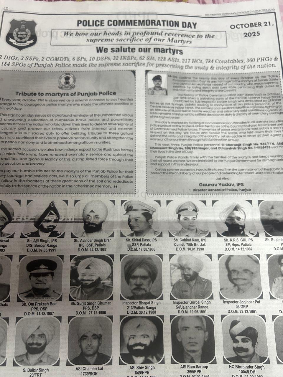For a moment forgot Bhullar DIG.Ropar range- Punjab Police had made supreme sacrifices by laying down their lives in the line of the duty to save the society and the Nation.On occasion of Police Commemoration Day on Monday Punjab Police has saluted its martyrs by issuing full page advertisements in leading newspapers.It says that 2 DIG,3 SSP,s 2 COMDTs ,6 SPs,10 DSPs,32 INSPs,62 SIs,128 ASIs,217 HCs,784 Constables ,360 PHGs& 180 SPOs of Punjab Police made the Supreme sacrifice for preserving the unity & integrity of the nation.Punjab DGP,Gaurav Yadav in his message has stated “ Punjab Police stands firmly with the families of the martyrs and keeps working for their all round welfare.We are indebted to the Punjab government for its magnanimity and support in this endeavour “Tailpiece.Admitted that during hey days of terrorism some Cops have misused their powers but it is a fact that at that time when even Judges had refused to hear cases it was Police which stood against terrorists.