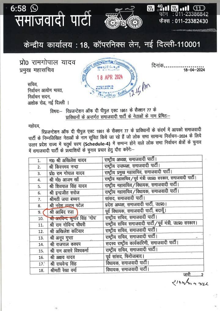 बदायूं। तेजतर्रार भाषण व मेहनत को देखते हुए चौथे चरण के लिए समाजवादी पार्टी ने सीनियर क्रम में आबिद रजा को बनाया स्टार प्रचारक